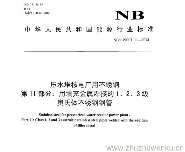 NB/T 20007.11-2013 pdf下载 压水堆核电厂用不锈钢 第11部分:用填充金属焊接的1、2、3级 奥氏体不锈钢钢管。Stainless steel for pressurized water reactor power plant – Part 11: Class 1, 2 and 3 austenitic stainless steel pipes welded with the addition of fller metal.