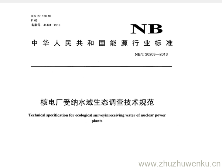 NB/T 20203-2013 pdf下载 核电厂受纳水域生态调查技术规范。Technical specification for ecological surveyinreceiving water of nuclear power plants.