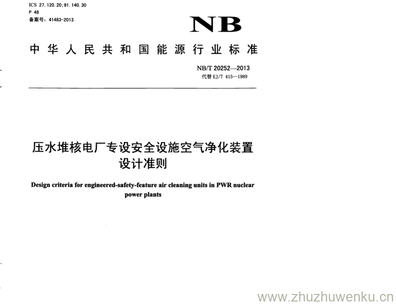 NB/T 20252-2013 pdf下载 压水堆核电厂专设安全设施空气净化装置 设计准则。Design criteria for engineered-safety-feature air cleaning units in PWR nuclear power plants.