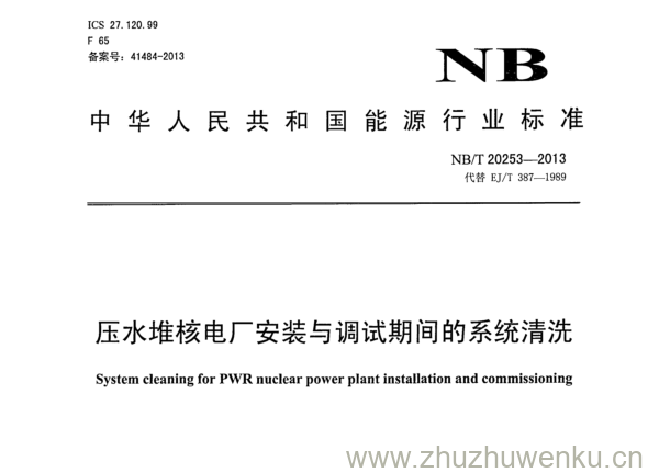 NB/T 20253-2013 pdf下载 压水堆核电厂安装与调试期间的系统清洗。System cleaning for PWR nuclear power plant installation and commissioning.