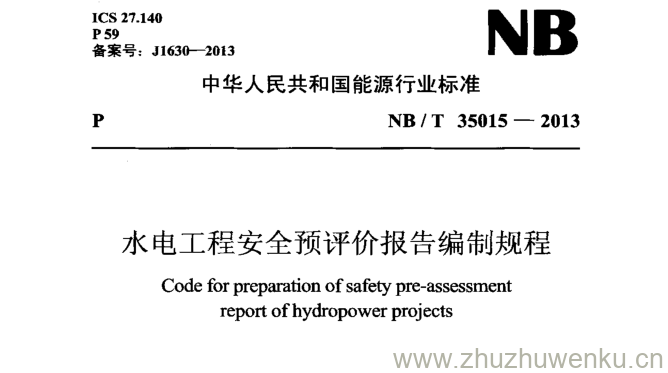 NB/T 35015-2013 pdf下载 水电工程安全预评价报告编制规程。Code for preparation of safety pre -assessment report of hydropower projects.