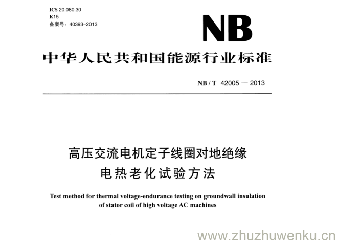 NB/T 42005-2013 pdf下载 高压交流电机定子线圈对地绝缘 电热老化试验方法。Test method for thermal voltage-endurance testing on groundwall insulation of stator coil of high voltage AC machines.