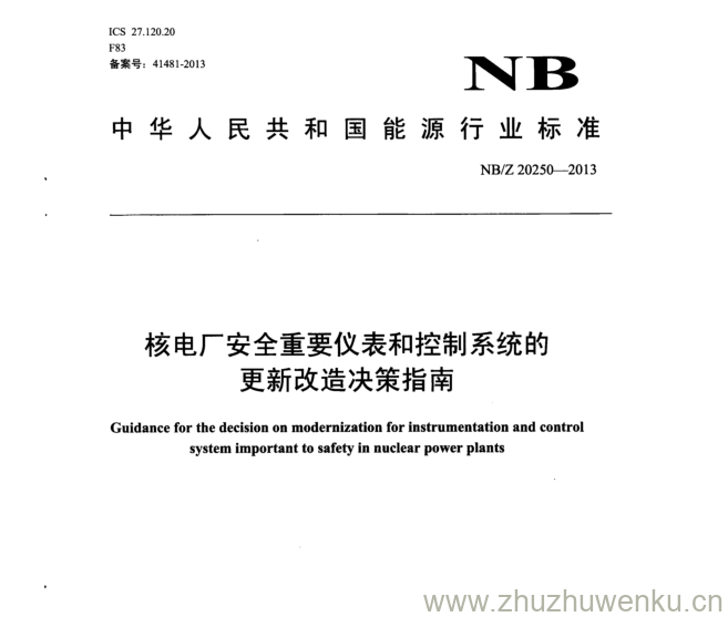NB/Z 20250-2013 pdf下载 核电厂安全重要仪表和控制系统的 更新改造决策指南。Guidance for the decision on modernization for instrumentation and control system important to safety in nuclear power plants.