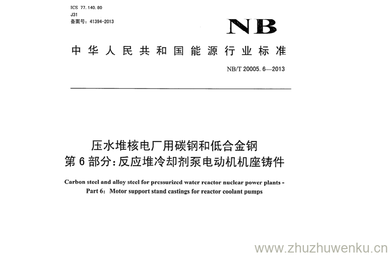 NB/T 20005.6–2013 pdf下载 压水堆核电厂用碳钢和低合金钢 第6部分:反应堆冷却剂泵电动机机座铸件.Carbon steel and alloy steel for pressurized water reactor nuclear power plants – Part 6: Motor support stand castings for reactor coolant pumps.