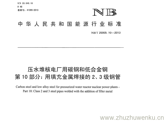 NB/T 20005.10-2013 pdf下载 压水堆核电厂用碳钢和低合金钢 第10部分:用填充金属焊接的2、3级钢管。Carbon steel and low alloy steel for pressurized water reactor nuclear power plants – Part 10: Class 2 and 3 steel pipes welded with the adition of fller metal.