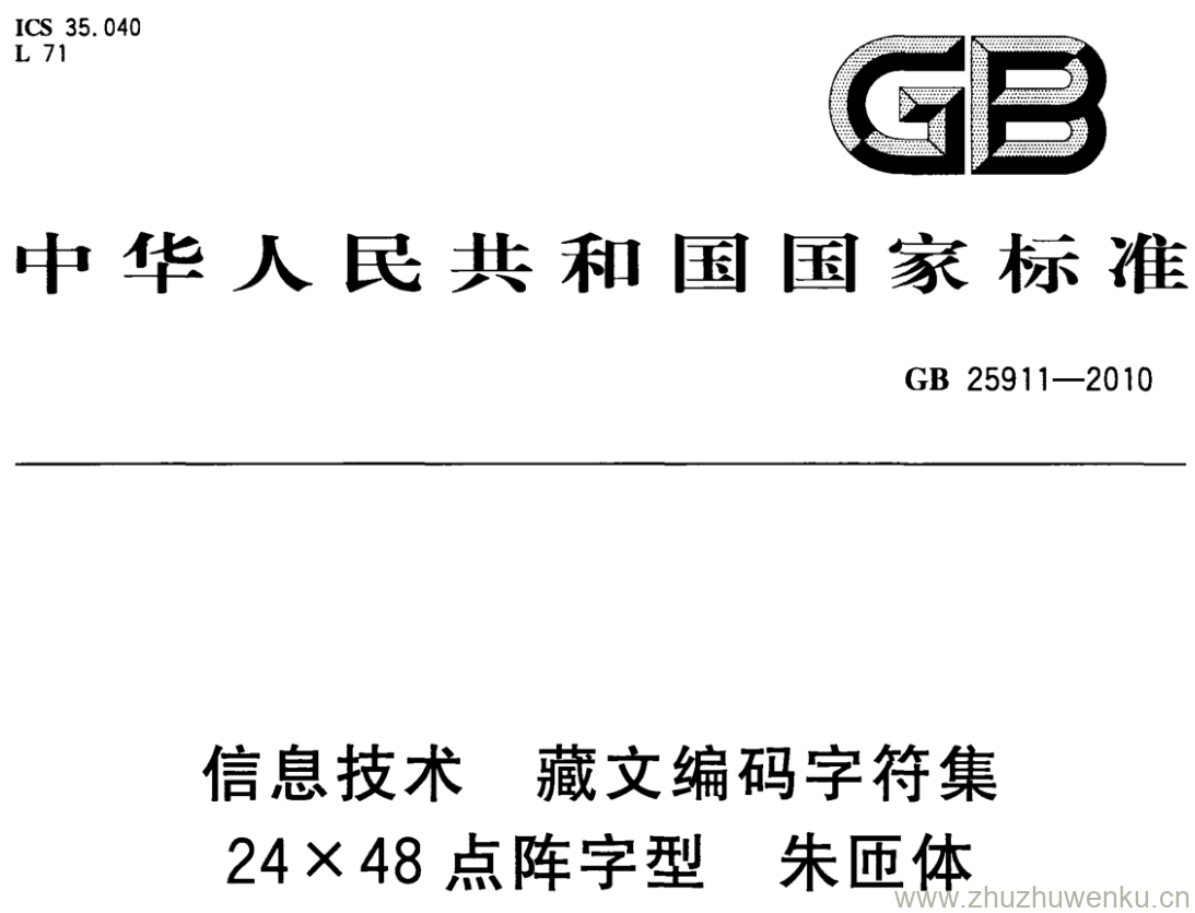 GB/T 25911-2010 pdf下载 信息技术 藏文编码字符集 24X48点阵字型 朱匝体