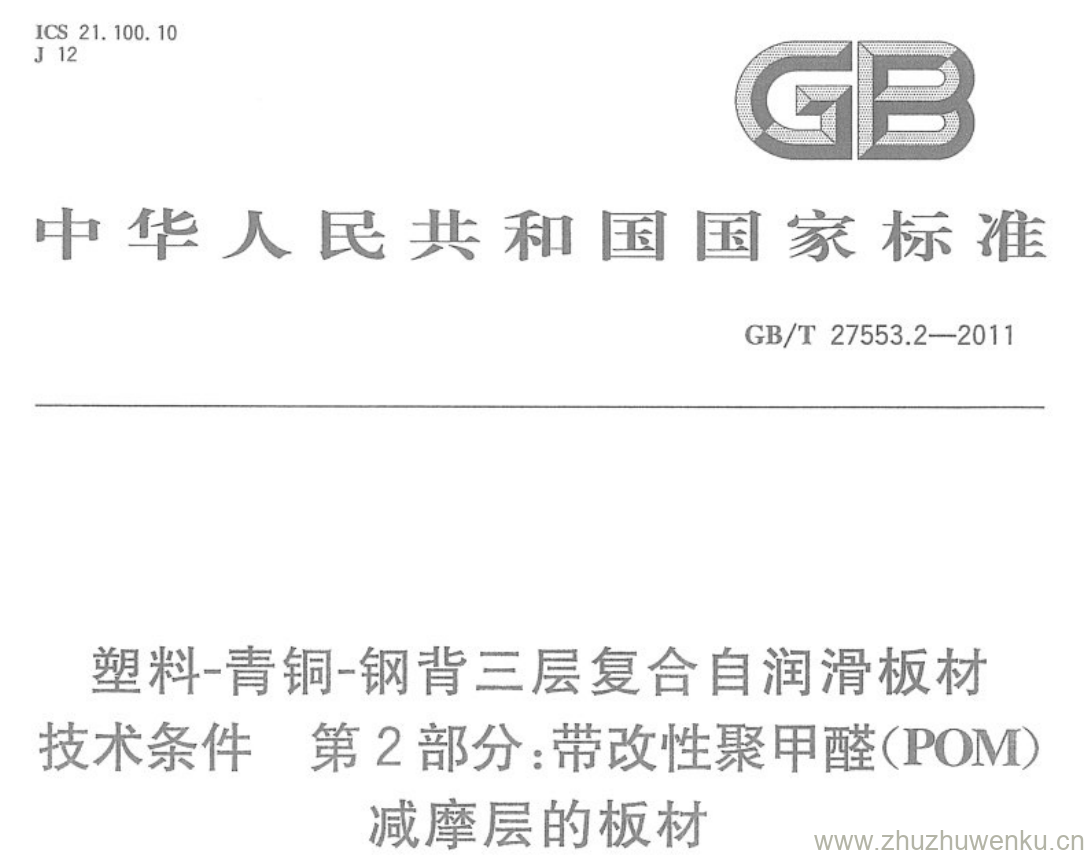GB/T 27553.2-2011 pdf下载 塑料-青铜-钢背三层复合自润滑板材 技术条件第2部分:带改性聚甲醛(POM)减摩层的板材