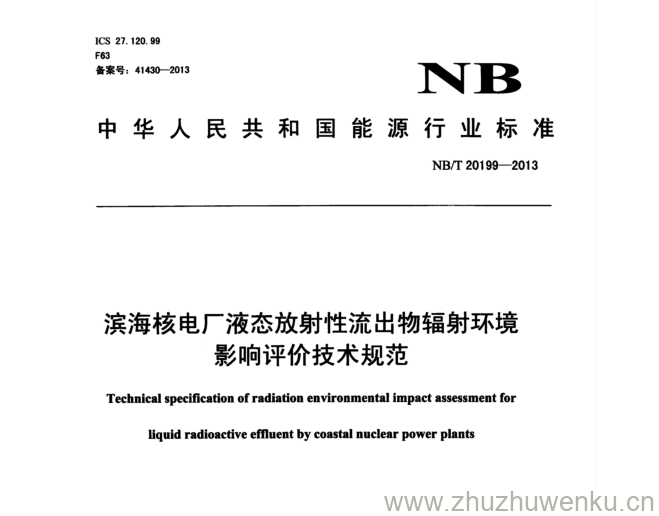 NB/T 20199-2013 pdf下载 滨海核电厂液态放射性流出物辐射环境 影响评价技术规范