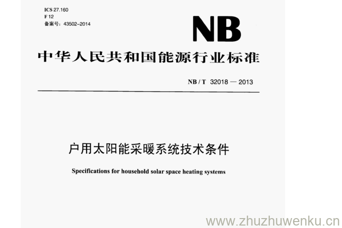 NB/T 32018-2013 pdf下载 户用太阳能采暖系统技术条件。Specifications for household solar space heating systems.