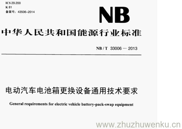 NB/T 33006-2013 pdf下载 电动汽车电池箱更换设备通用技术要求。General requirements for etrie vehicle battery-pack- swap equipment.