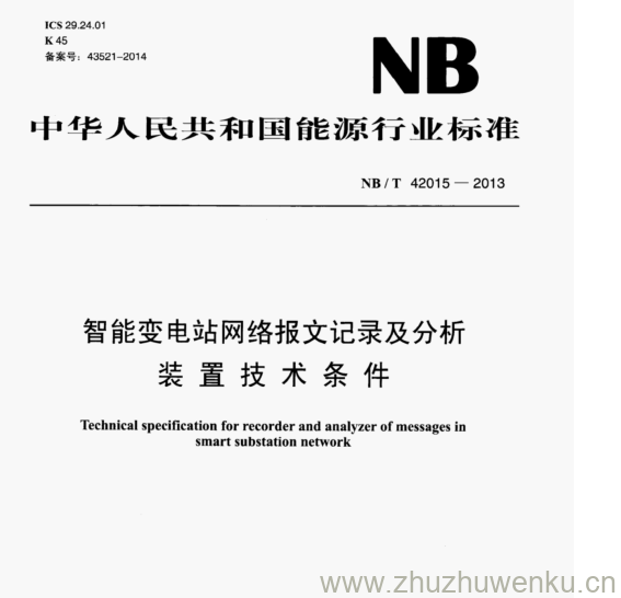 NB/T 42015-2013 pdf下载 智能变电站网络报文记录及分析 装置技术条件。 Technical specification for recorder and analyzer of messages in smart substation network.