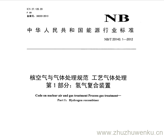 NB/T 20143.1-2012 pdf下载 核空气与气体处理规范工艺气体处理 第1部分:氢气复合装置。Code on nuclear air and gas treatment Process gas treatment- Part1: Hydrogen reconmbiner.