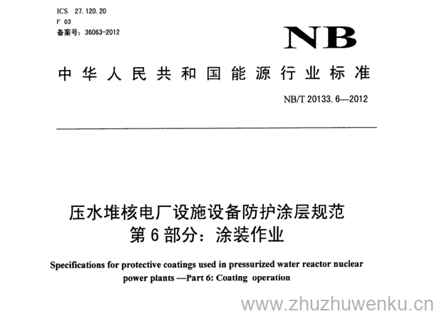 NB/T 20133.6-2012 pdf下载 压水堆核电厂设施设备防护涂层规范. 第6部分:涂装作业。Speeifications for protective coatings used in pressurized water reactor nuclear power plants – -Part 6: Coating operation.