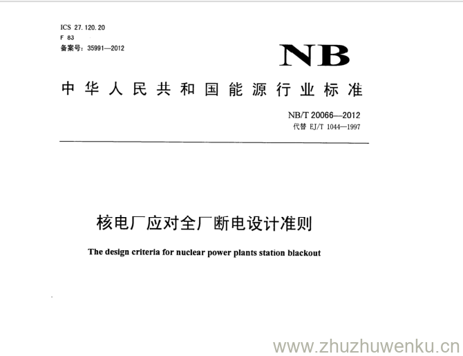NB/T 20066-2012 pdf下载 核电厂应对全厂断电设计准则。The design criterla for nuclear power plants station blackout.