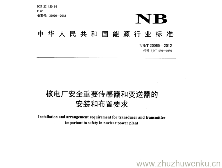 NB/T 20065-2012 pdf下载 核电厂安全重要传感器和变送器的 安装和布置要求。Installation and arrangement requirement for transducer and transmitter important to safety in nuclear power plant.