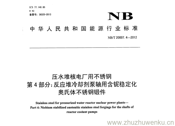 NB/T 20007.4-2012 pdf下载 压水堆核电厂用不锈钢 第4部分:反应堆冷却剂泵轴用含铌稳定化 奥氏体不锈钢锻件。Stainless steel for pressurized water reactor nuclear power plants- Part 4: Niobium stabilized austenitic stainless steel forgings for the shafts of reactor coolant pumps.