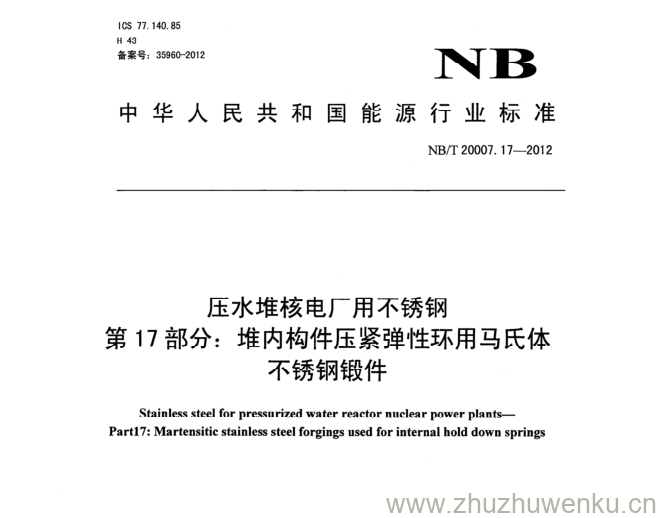 NB/T 20007.17-2012 pdf下载 压水堆核电厂用不锈钢 第17部分:堆内构件压紧弹性环用马氏体. 不锈钢锻件。Stainless steel for pressurized water reactor nuclear power plants- Part17: Martensitic stainless steel forgings used for internal hold down springs.