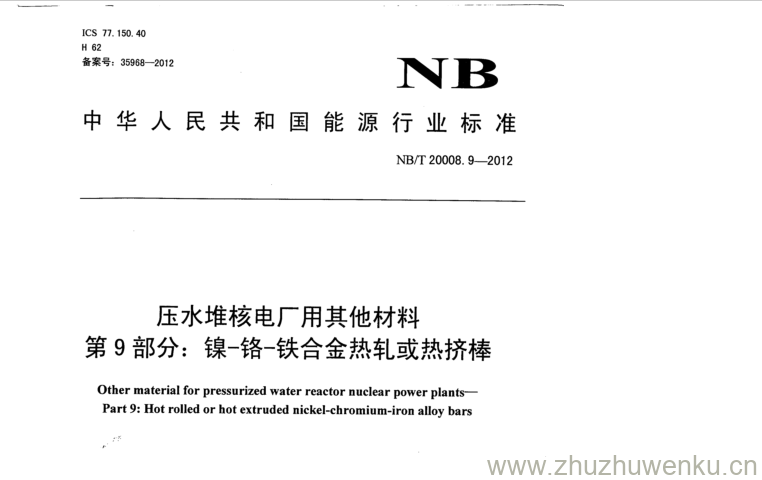 NB/T 20008.9-2012 pdf下载 压水堆核电厂用其他材料 第9部分:镍-铬-铁合金热轧或热挤棒。Other material for pressurized water reactor nuclear power plants- Part 9: Hot rolled or hot extruded nickel chromium-iron alloy bars.