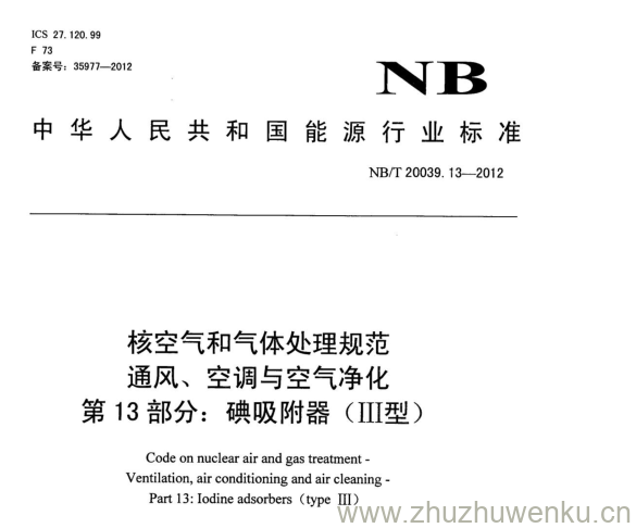NB/T 20039.13-2012 pdf下载 核空气和气体处理规范 通风、空调与空气净化 第13部分:碘吸附器(III型)。Code on nuclear air and gas treatment – Ventilation, air conditioning and air cleaning – Part 13: Ilodine adsorbers (type II).