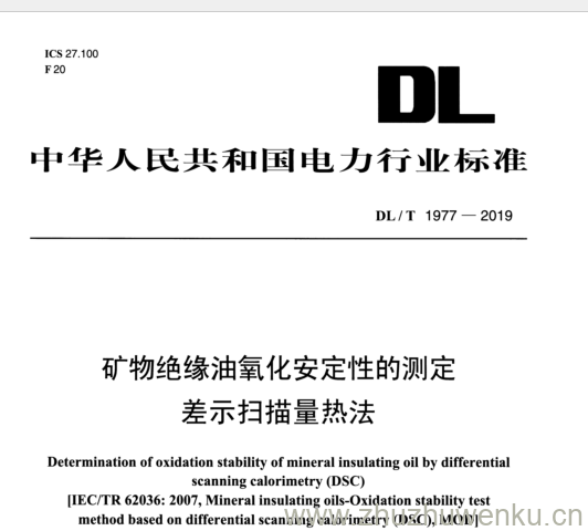 DL/T 1977-2019 pdf下载 矿物绝缘油氧化安定性的测定 差示扫描量热法。Determination of oxidation stability of mineral insulating oil by differential scanning calorimetry (DSC) [IEC/TR 62036: 2007, Mineral insulating oils-Oxidation stability test method based on differential scanning calorimetry (DSC), MOD].