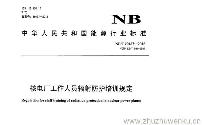 NB/T 20137-2012 pdf下载 核电厂工作人员辐射防护培训规定。Regulation for staff training of radiation protection in nuclear power plants.
