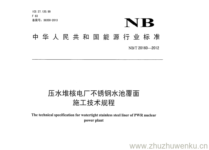 NB/T 20160-2012 pdf下载 压水堆核电厂不锈钢水池覆面 施工技术规程。The technical specification for watertight stainless steel liner of PWR nuclear power plant.