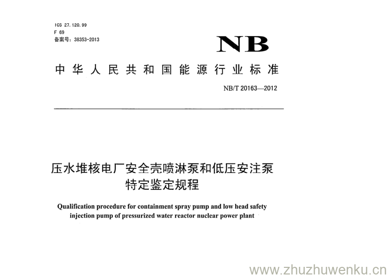 NB/T 20163-2012 pdf下载 压水堆核电厂安全壳喷淋泵和低压安注泵 特定鉴定规程。 Qualification procedure for containment spray pump and low head safety injection pump of pressurized water reactor nuclear power plant.