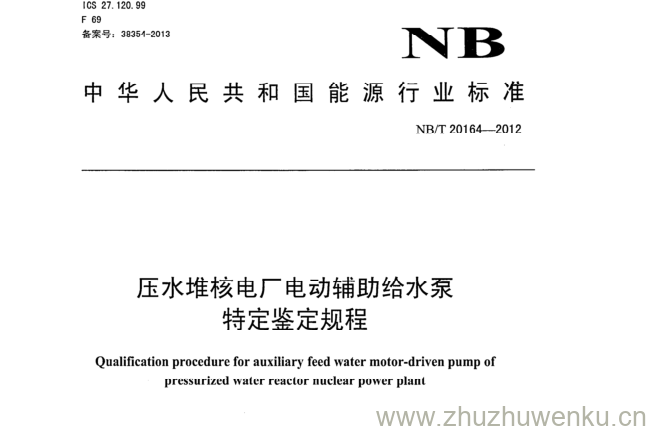 NB/T 20164-2012 pdf下载 压水堆核电厂电动辅助给水泵 特定鉴定规程。 Qualifcation procedure for auxiliary feed water motor-driven pump of pressurized water reactor nuclear power plant.