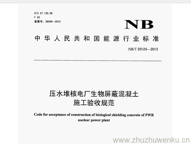 NB/T 20124-2012 pdf下载 压水堆核电厂生物屏蔽混凝土 施工验收规范。Code for acceptance of construction of biological shielding concrete of PWR nuclear power plant.