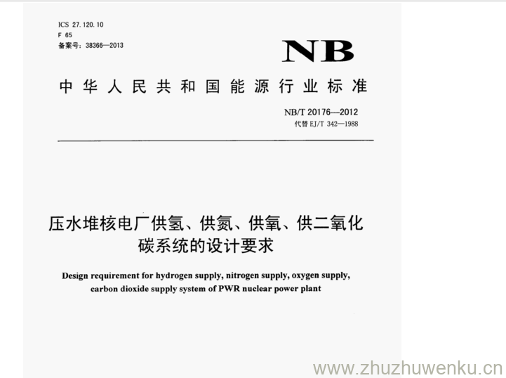 NB/T 20176-2012 pdf下载 压水堆核电厂供氢、供氮、供氧、供二氧化 碳系统的设计要求。Design requirement for hydrogen supply, nitrogen supply, oxygen supply, carbon dioxide supply system of PWR nuclear power plant.
