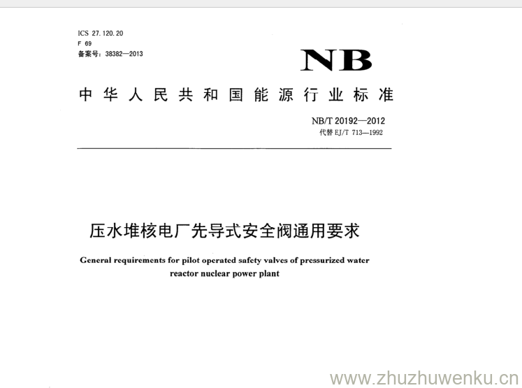 NB/T 20192-2012 pdf下载 压水堆核电厂先导式安全阀通用要求。General requirements for pilot opcrated safety valves of pressurized water reactor nuclear power plant.
