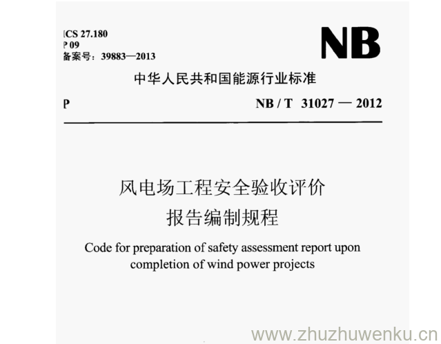 NB/T 31027-2012 pdf下载 风电场工程安全验收评价 报告编制规程。Code for preparation of safety asessment report upon completion of wind power projects.