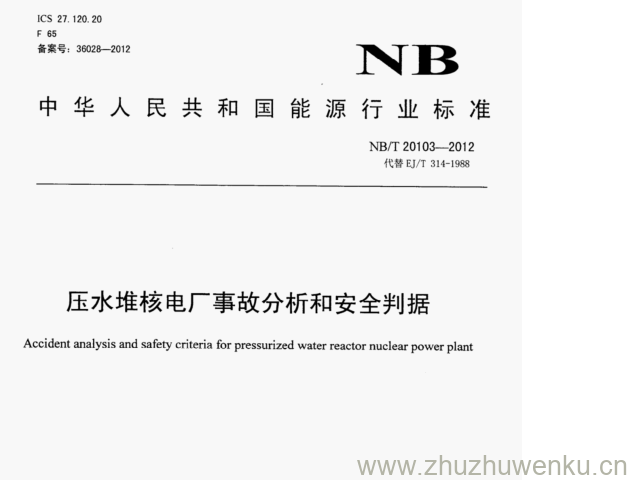 NB/T 20103-2012 pdf下载 压水堆核电厂事故分析和安全判据。Accident analysis and safety criteria for pessrized water reactor nucler power plant.