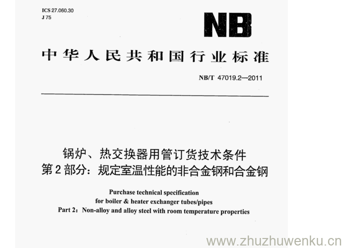 NB/T 47019.2-2011 pdf下载 锅炉、热交换器用管订货技术条件 第2部分:规定室温性能的非合金钢和合金钢。Purchase technical specification for boiler & heater exchanger tubes/pipes Part 2: Nonally and aly seel with room temperature properties.