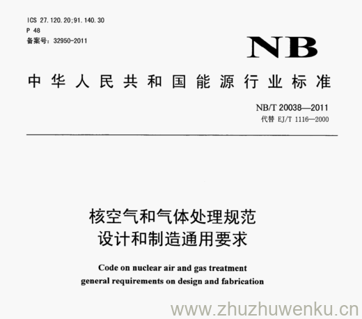 NB/T 20038-2011 pdf下载 核空气和气体处理规范 设计和制造通用要求。 Code on nuclear air and gas treatment general requirements on design and fabrication.