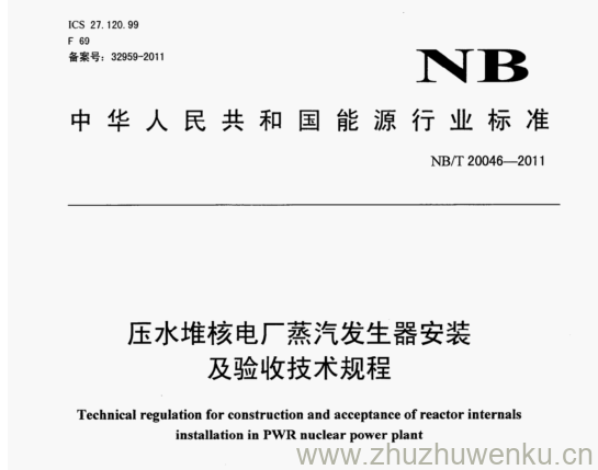 NB/T 20046-2011 pdf下载 压水堆核电厂蒸汽发生器安装 及验收技术规程。Technical regulation for construction and aceptance of reactor internals installation in PWR nuclear power plant.