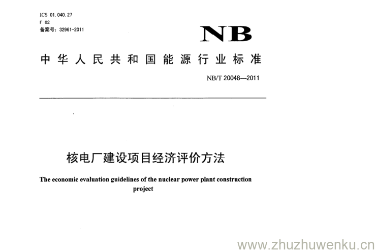 NB/T 20048-2011 pdf下载 核电厂建设项目经济评价方法。The economic evaluation guidelines of the nuclear power plant construction projeet.