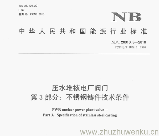 NB/T 20010.3-2010 pdf下载 压水堆核电厂阀门 第3部分:不锈钢铸件技术条件