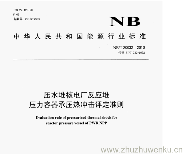 NB/T 20032-2010 pdf下载 压水堆核电厂反应堆 压力容器承压热冲击评定准则。Evaluation rule of pressurized thermal shock for reactor pressure vessel of PWR NPP.