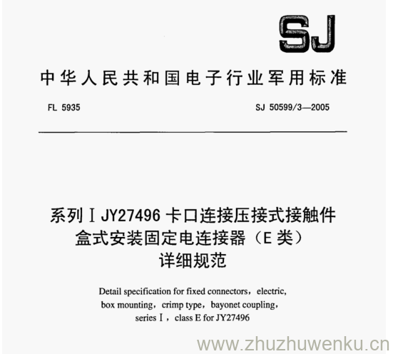 SJ 50920.3-2005 pdf下载 系列IJY27496卡口连接压接式接触件 盒式安装固定电连接器(E 类) 详细规范。Detail specifcation for fixed connectors, electric, box mounting, crimp type, bayonet coupling, series I,class E for JY27496.
