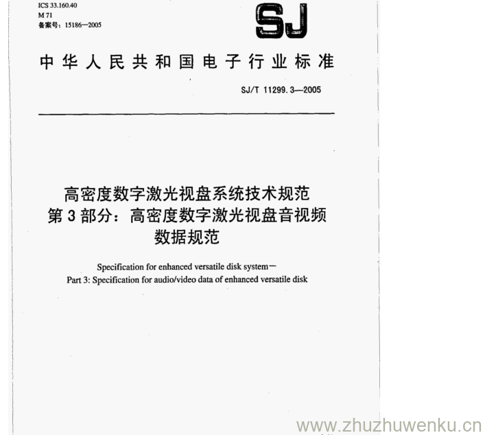 SJ 11299.3-2005 pdf下载 高密度数字激光视盘系统技术规范 第3部分:高密度数字激光视盘音视频 数据规范。Specification for enbanced versatile disk system- Part 3: Specification for audio/video data of enhanced versatile disk.