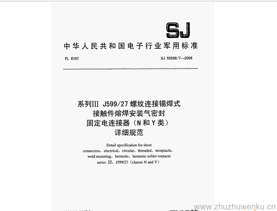 SJ 50599.7-2006 pdf下载 系列II J599/27 螺纹连接锡焊式 接触件熔焊安装气密封 固定电连接器(N和Y类) 详细规范。Detail specifcation for sheet connectors, electrical, circular, threaded, receptacle, weld mounting,hermetic, hermetic solder contacts series I,J599/27 (classes N and Y).