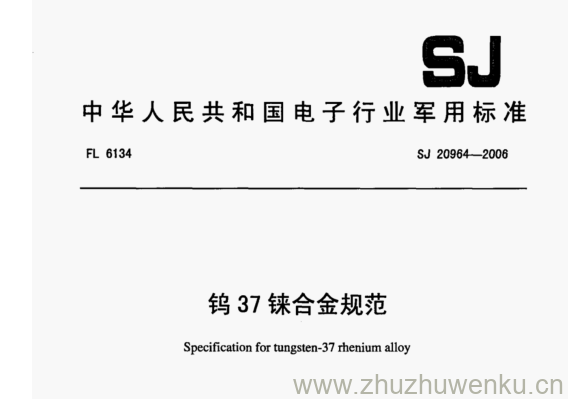 SJ 20964-2006 pdf下载 钨37铼合金规范。Specification for tungsten-37 thenium aly.