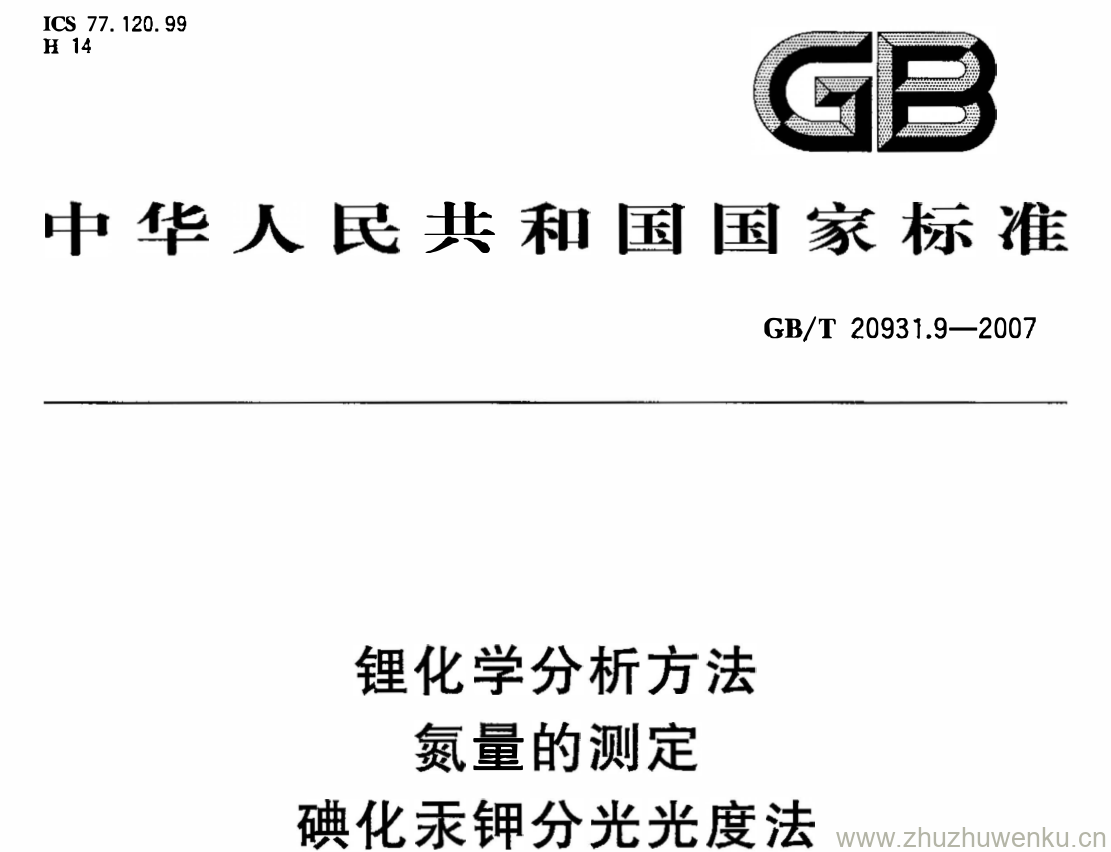 GB/T 20931.9-2007 pdf下载 锂化学分析方法 氮量的测定 碘化汞钾分光光度法