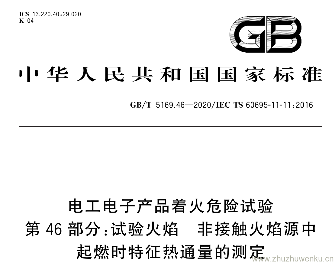 GB/T 5169.46-2020 pdf下载 电工电子产品着火危险试验 第 46 部分: 试验火焰 非接触火焰源中 起燃时特征热通量的测定