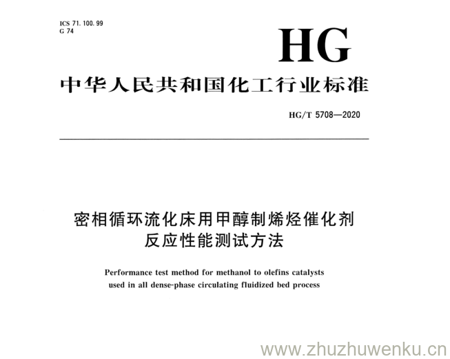 HG/T 5708-2020 pdf下载 密相循环流化床用甲醇制烯烃催化剂 反应性能测试方法 。Performance test method for methanol to olefins catalysts used in all denst- phase circulating fluidized bed process .