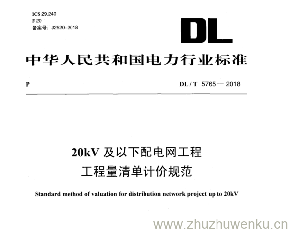 DL/T 5765-2018 pdf下载 20kV 及以下配电网工程 工程量清单计价规范。Standard method ofvaluation for distribution network project up to 20kV.
