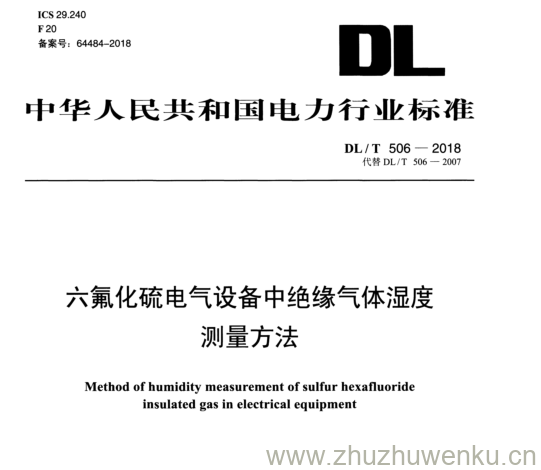 DL/T 506-2018 pdf下载 六氟化硫电气设备中绝缘气体湿度 测量方法。Method of humidity measurement of sulfur hexafluoride insulated gas in electrical equipment.