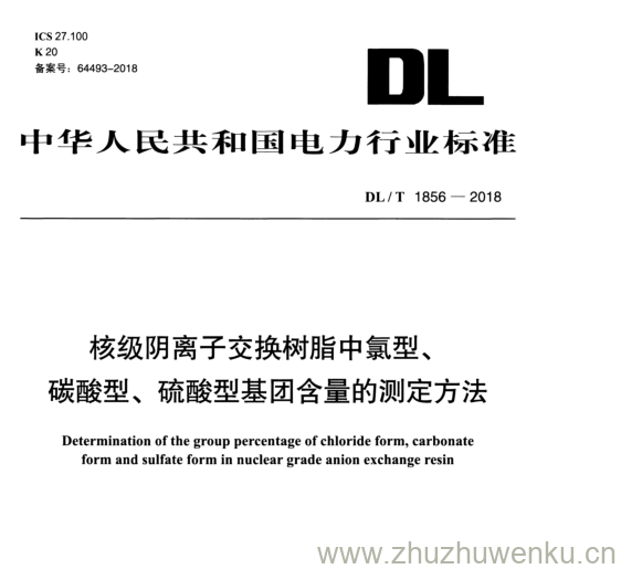 DL/T 1856-2018 pdf下载 核级阴离子交换树脂中氯型、 碳酸型、硫酸型基团含量的测定方法。Determination of the group percentage of chloride form, carbonate form and sulfate form in nuclear grade anion exchange resin.