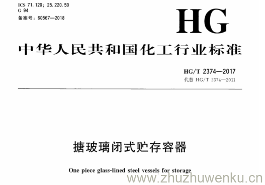 HG/T 2374-2017 pdf下载 搪玻璃闭式贮存容器。 One piece glass-lined steel vessels for storage.